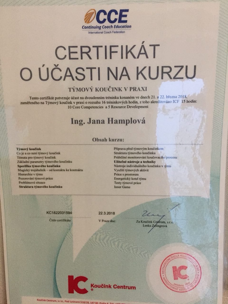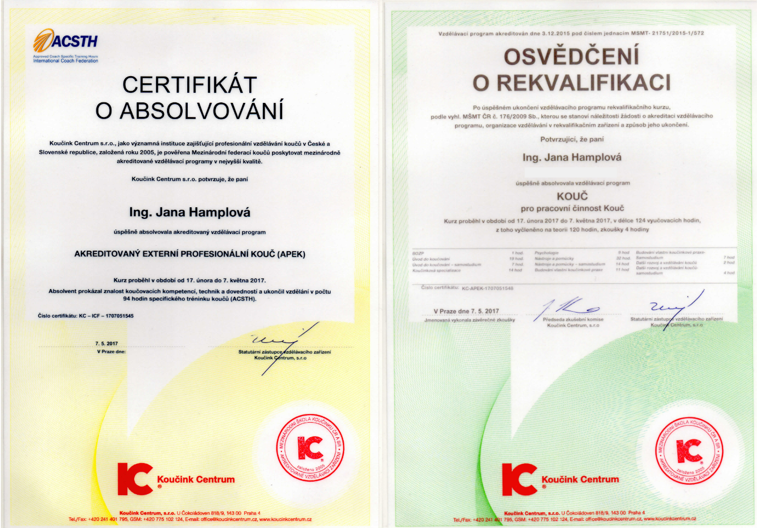 | Akreditovaný profesionální kouč | Koučink Centrum s.r.o. | 120 | ICF ACSTH | 2017 | Náhled |
