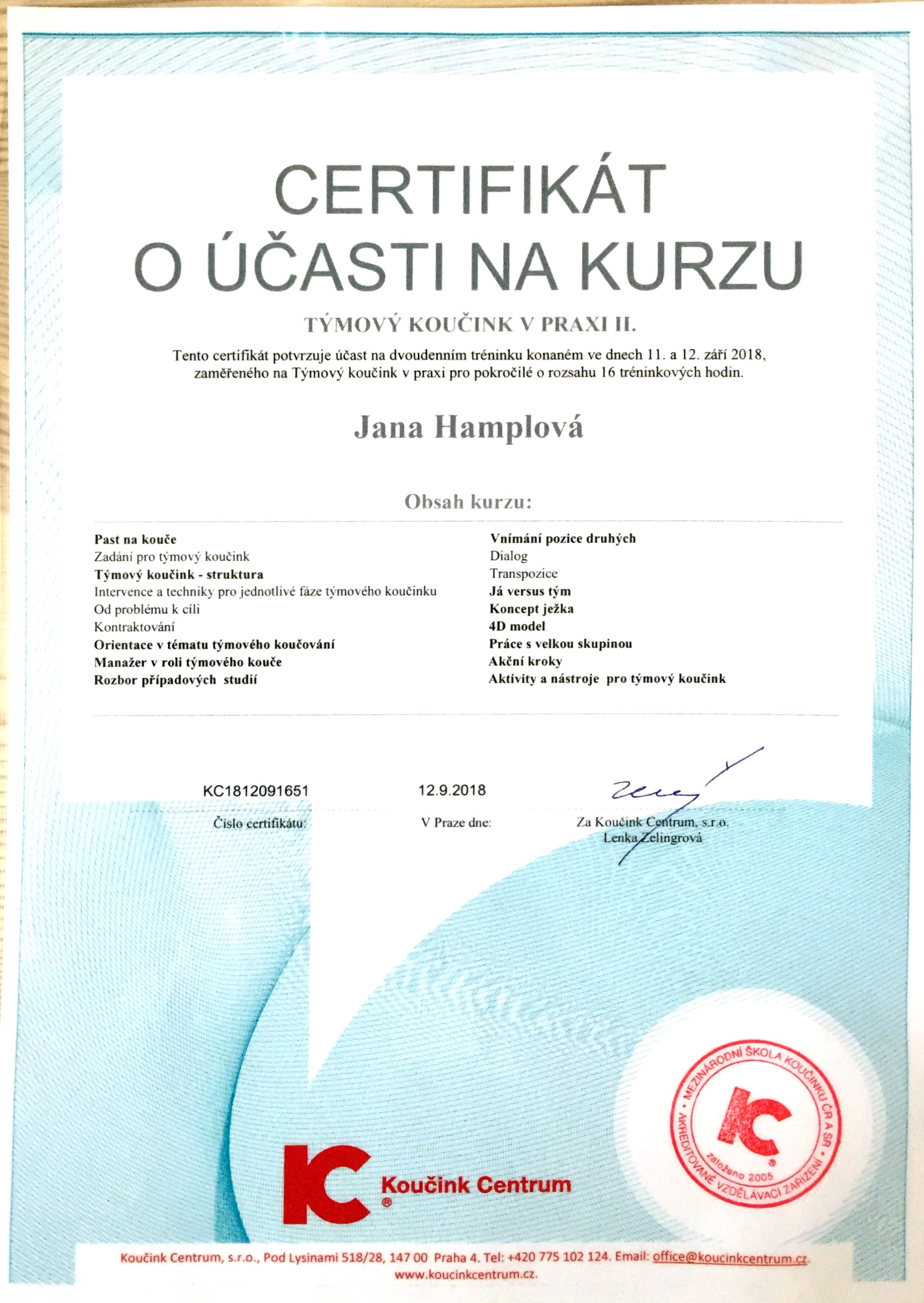 | Dvoudenní (16-ti hodinový) tréninkový kurz zahrnující metody a práci na praktických příkladech v týmovém koučování. Týmový koučink v praxi obsahuje využití týmových aktivit, testy týmové práce včetně nástrojů vhodných k týmovému koučování. | |||||