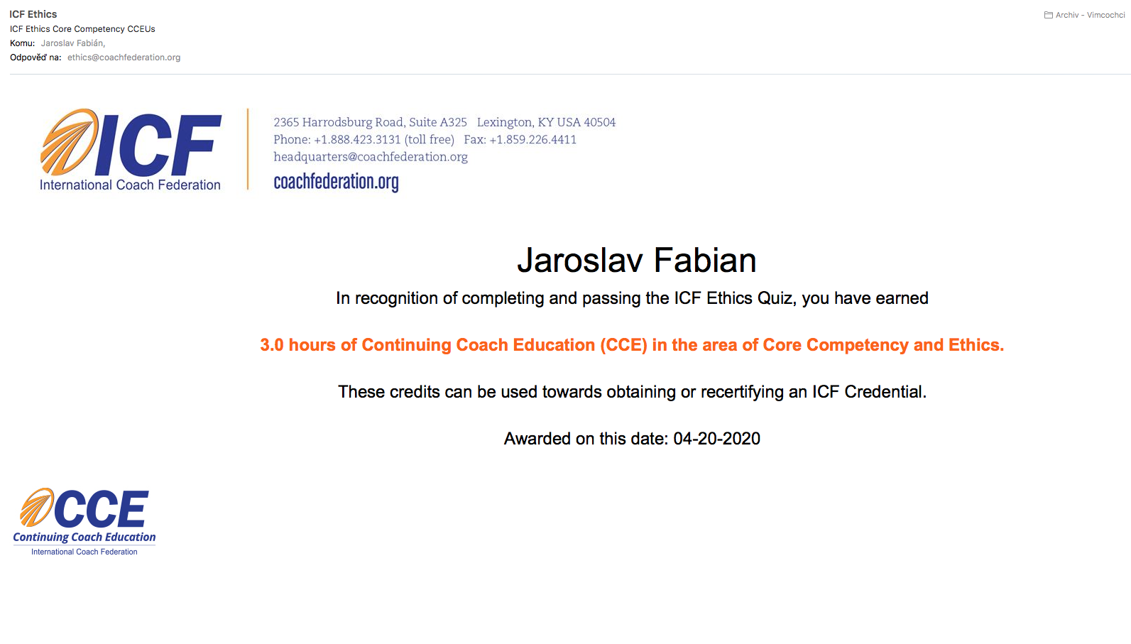 | Core competences and Ethics | ICF | 3 | ICF CCEU | 2020 | Náhled |