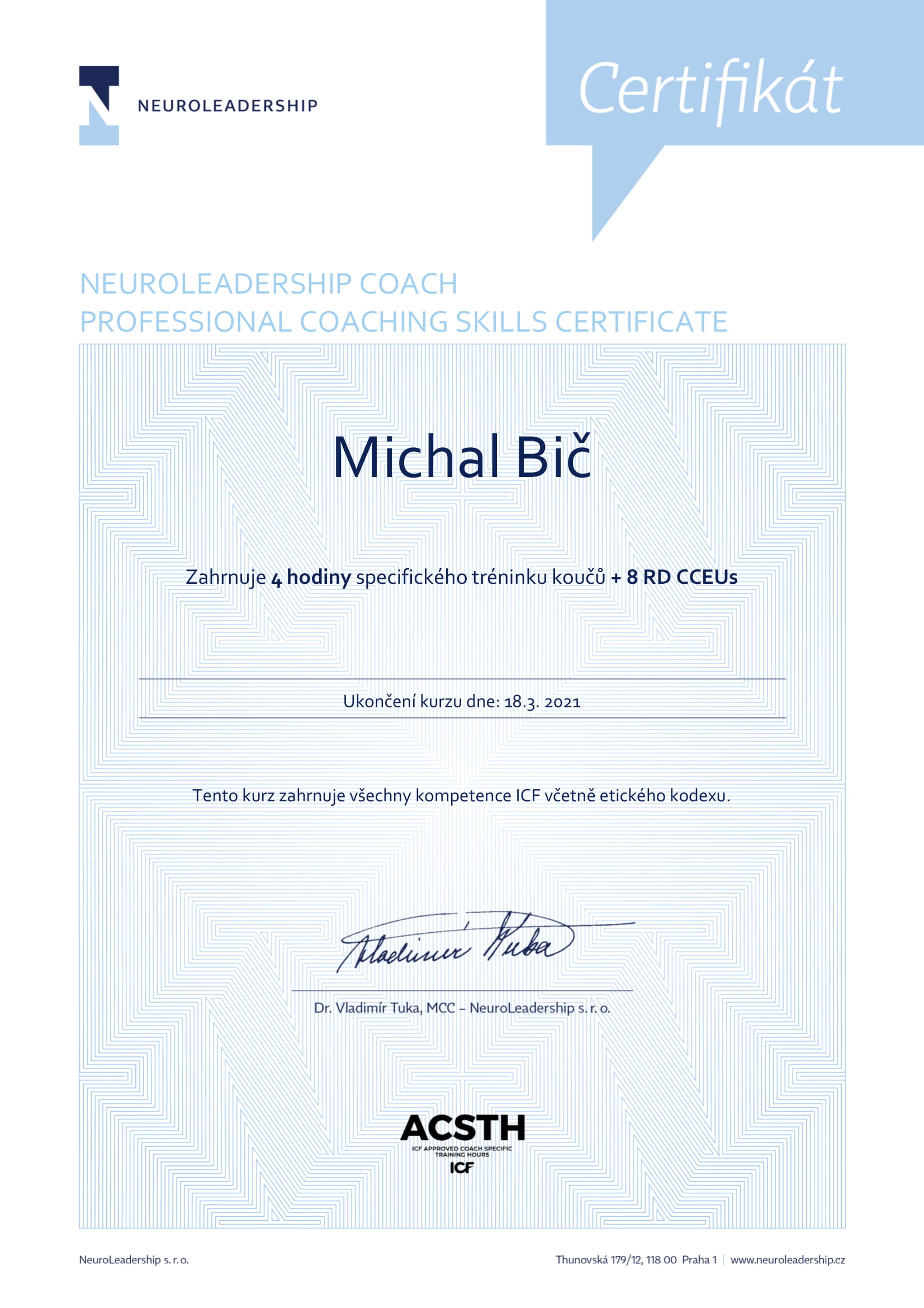 | Neuroleadership - Professional coaching skills | Neuroleadership, s. r. o. | 12 | ICF ACSTH | 2021 | Náhled |