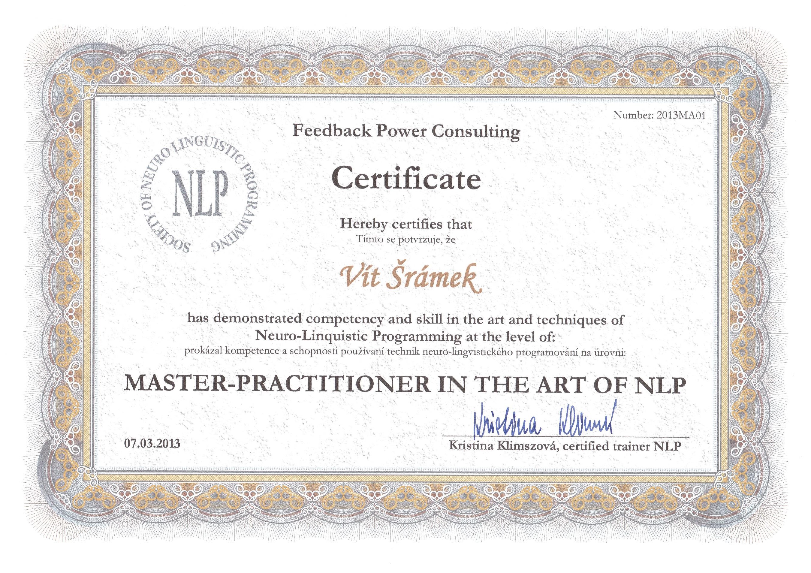 | Master-Practitioner in the Art of NLP | Kristina Klimszová, Certified NLP Trainer | 96 | Bez ICF akreditace | 2013 | Náhled |