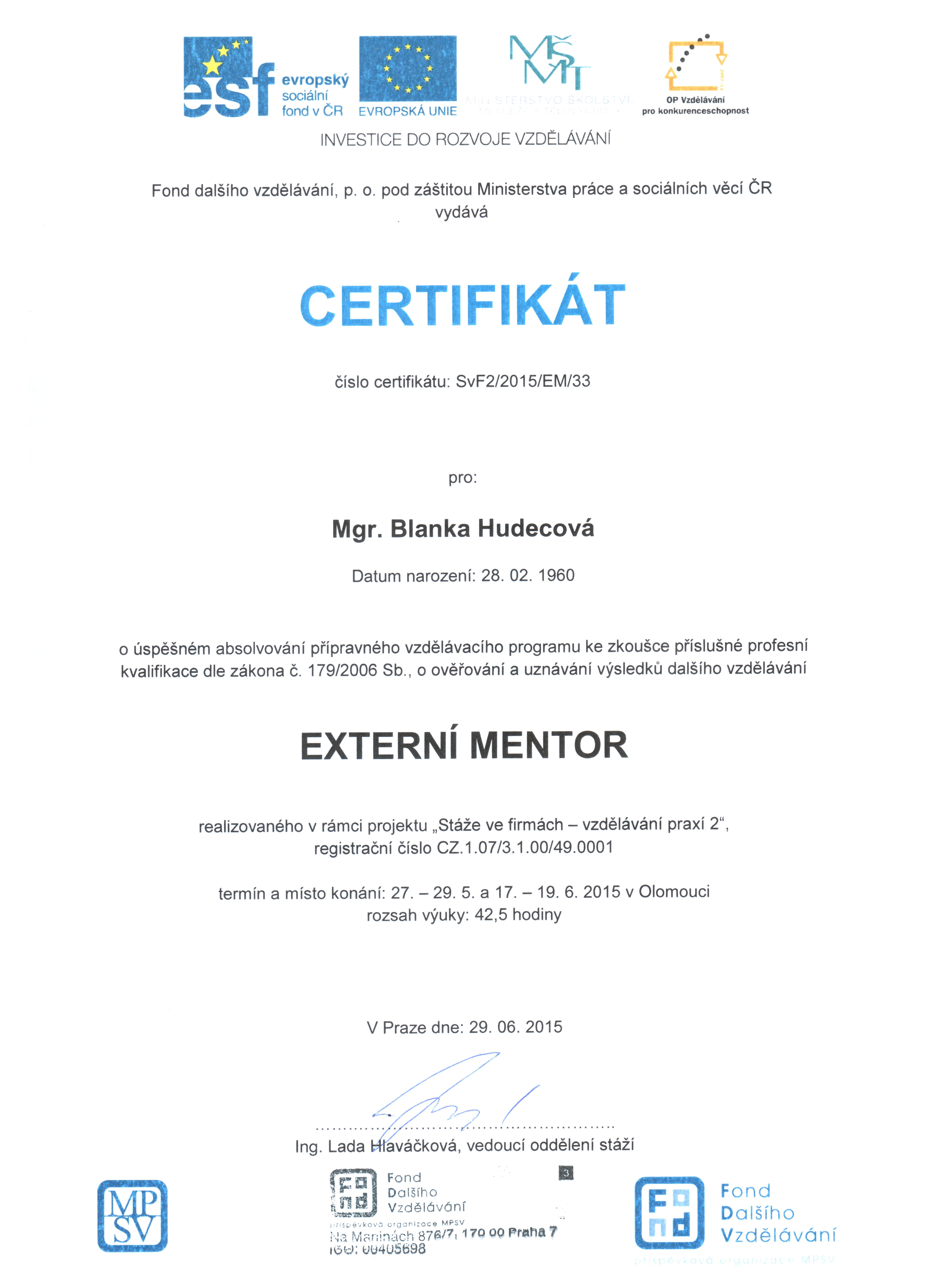| Externí Mentor | Fond Dalšího Vzdělávání | 43 | Bez ICF akreditace | 2015 | Náhled |