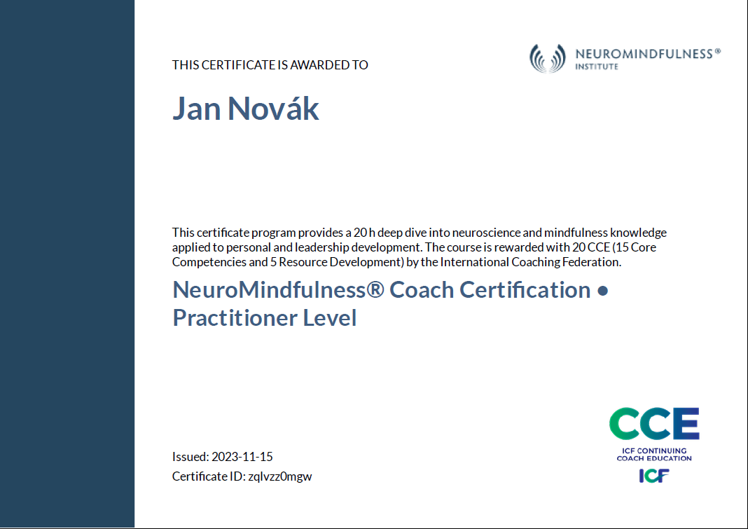 | NeuroMindfulness Coach Certification | NeuroMindfulness Institute | 20 | ICF CCEU | 2023 | Náhled |