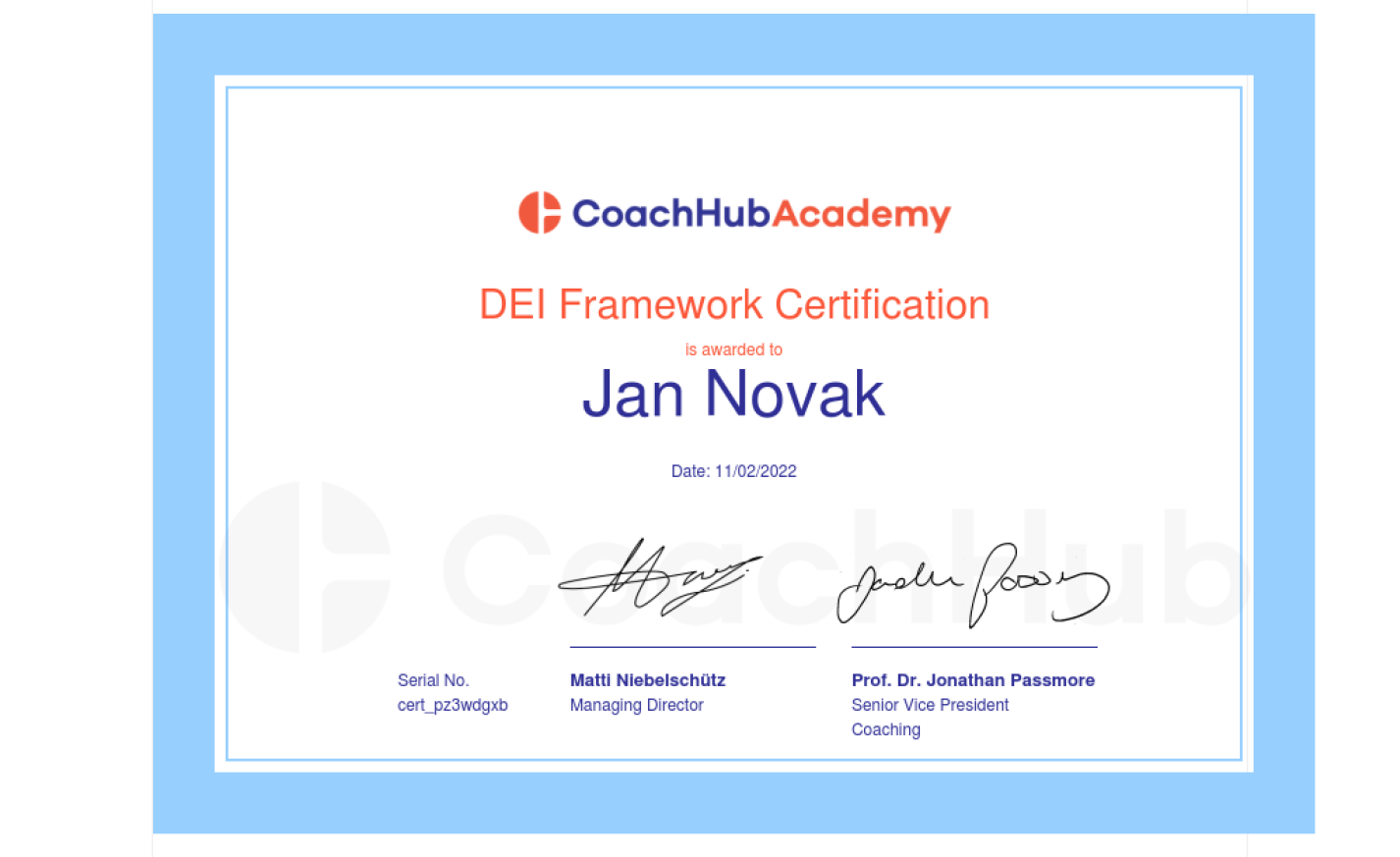 | DEI Framework Certification | CoachHub Academy | 0 | Bez ICF akreditace | 2022 | Náhled |